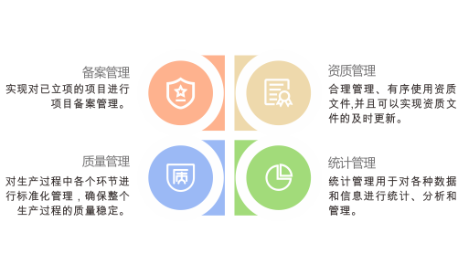 企业为了实现科学管理、优化资源配置、提高经济效益而建立的管理系统。包含了备案管理、资质管理、质量管理、统计管理等模块。实现对已立项的项目进行项目备案管理;合理管理、有序使用资质文件,并且可以实现资质文件的及时更新;对生产过程中的各个环节进行标准化管理,确保整个生产过程的质量稳定、可控;统计管理用于对各种数据和信息进行统计、分析和管理。它通过收集整理和分析数据,为企业的决策提供依据,帮助企业实现高效运营和持续发展。