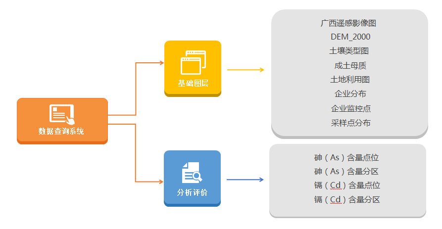 基于历史点位数据、土地利用数据、土壤类型数据、航拍影像、土壤采样数据、污染企业分布、成土母岩、 元素含量分析数据等数据,建立一套土壤数据查询分析系统,结合GIS技术提供数据的查询、检索、统计及分析等功能。