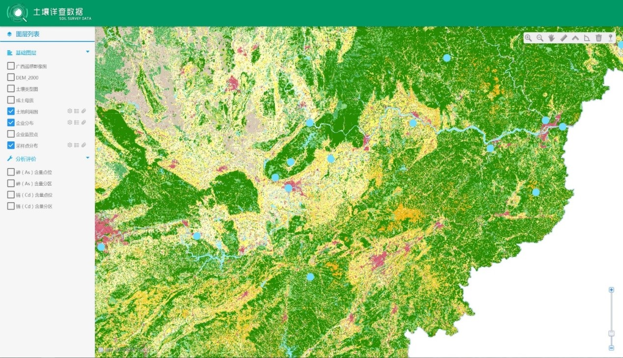 GIS平台可以提供给用户方便快捷的图形浏览功能,用户可以方便的对各种地理信息数据(点位分布信息、影像数据、DEM、 土地类型数据、成土母岩、企业分布情况、元素含量分布等)进行浏览和查询,并可以将各类数据进行叠加显示。